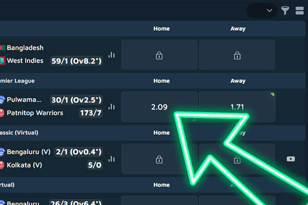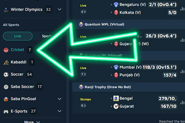 Open the Sports or Live tab and find a match through quick leagues or the search bar;