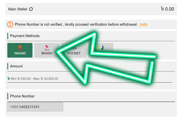 | bKash | 500 | 30000 | 15 min - 24 hours | Fastest when profile and wallet name match; off-peak requests clear sooner |